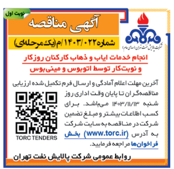 آخرین مهلت اعلام آمادگی و ارسال فرم تکمیل شده ارزیابی مناقصهگران تا پایان وقت اداری روز شنبه 13/11/1403 مـیباشد. بـرای کسب اطلاعات بیشتر و مبـلغ تضمین شرکت در منــاقصه به سایت شرکت به آدرس (www.torc.ir) بخش فراخوانها مراجعه فرمایید.