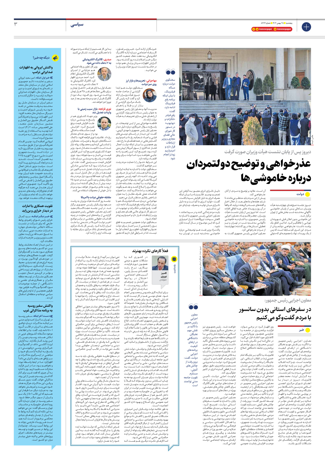 معاون اجرایی رئیسجمهور در پایان، با اشاره به اهمیت سفرهای استانی دولت، تصریح کرد: این سفرها بر مبنای مطالعات کارشناسی دقیق و مصوبات قانونی انجام میشود. در این سفرها، دولت بدون پردهپوشی و سانسور، با فعالان اقتصادی، سیاسی و فرهنگی به گفتوگو میپردازد. علاوه بر این، حضور وزرا در مناطق مختلف و پیگیری پروژههای عمرانی کشور، نقش مهمی در ارتقای سرمایه اجتماعی دولت ایفا میکند.