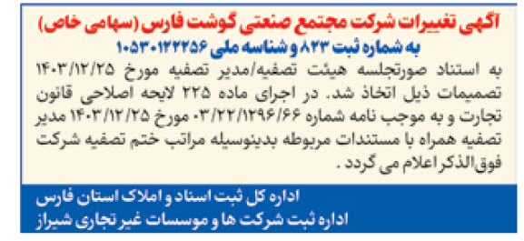 آگهی تغییرات شرکت مجتمع صنعتی گوشت فارس (سهامی خاص) به شماره ثبت ۸۲۳ و شناسه ملی ۱۰۵۳۰۱۲۲۲۵۶