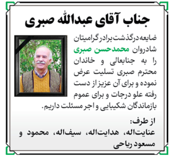 در حافظه موقت ذخیره شد... تصویر تسلیت نهاد غیر دولتی ۱۳ اردیبهشت ۱۴۰۴ شماره هشت هزار و هفتصد و بیست و نه - صفحه ۱۵ ضایعه درگذشت برادر گرامیتان شادروان محمدحسن صبری را به جنابعالی و خاندان محترم صبری تسلیت عرض نموده و برای آن عزیز از دست رفته علو درجات و برای عموم بازماندگان شکیبایی و اجر مسئلت داریم.