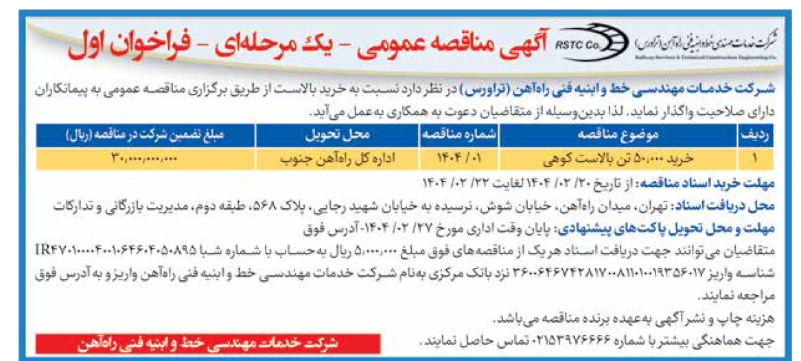1 خرید 50.000 تن بالاست کوهی 01 / 1404 اداره کل راهآهن جنوب 30.000.000.000