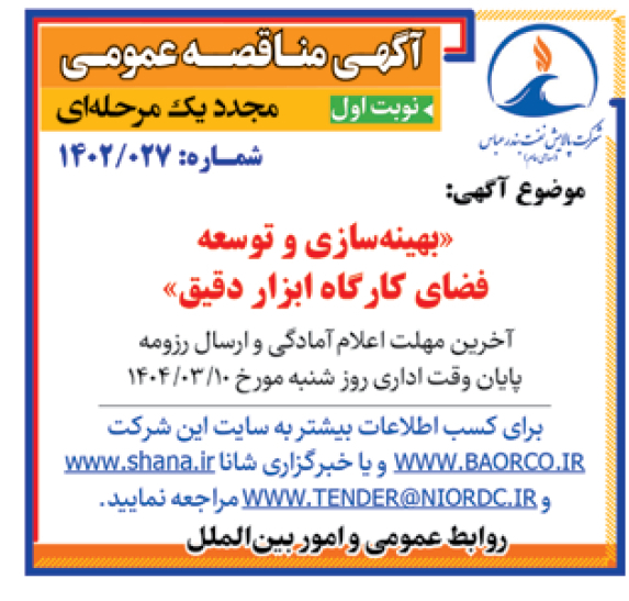 WWW.BAORCO.IR و یا خبرگزاری شانا www.shana.ir و WWW.TENDER@NIORDC.IR مراجعه نمایید.