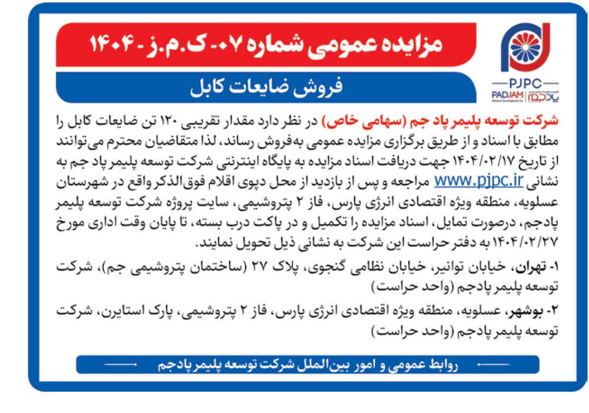 مزایده عمومی شماره ۰۷- ک.م.ز - ۱۴۰۴