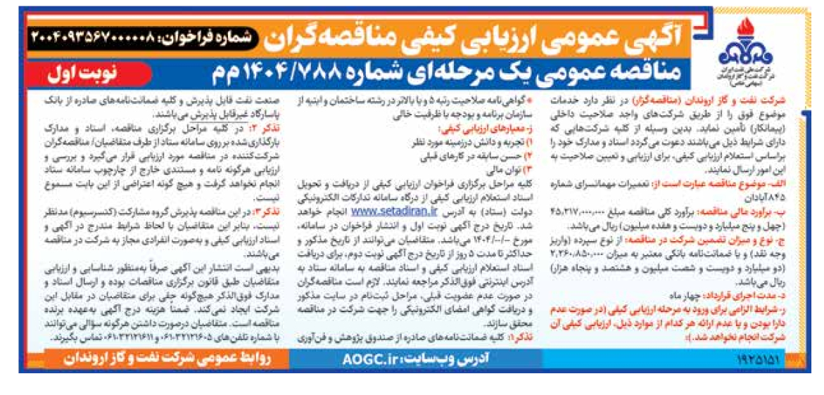 بدیهی است انتشار این آگهی صرفاً بهمنظور شناسایی و ارزیابی متقاضیان طبق قانون برگزاری مناقصات بوده و ارسال اسناد و مدارک فوقالذکر هیچگونه حقی برای متقاضیان در مقابل این شرکت ایجاد نمیکند. ضمناً هزینه درج آگهی بهعهده برنده مناقصه است. متقاضیان درصورت داشتن هرگونه سؤالی میتوانند با شماره تلفنهای 32121605-061 و 32121611-061 تماس بگیرند.