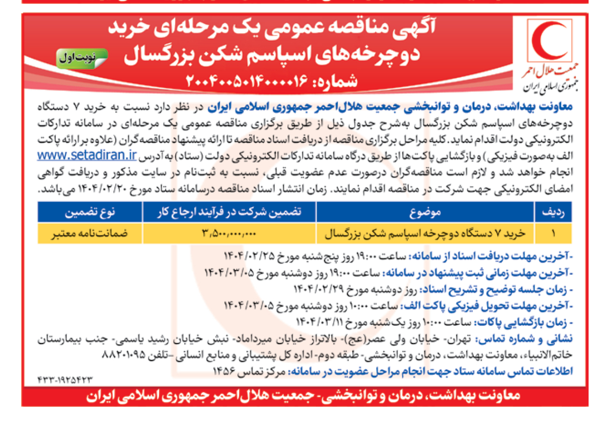 معاونت بهداشت، درمان و توانبخشی جمعیت هلالاحمر جمهوری اسلامی ایران در نظر دارد نسبت به خرید 7 دستگاه دوچرخههای اسپاسم شکن بزرگسال بهشرح جدول ذیل از طریق برگزاری مناقصه عمومی یک مرحلهای در سامانه تدارکات الکترونیکی دولت اقدام نماید.کلیه مراحل برگزاری مناقصه از دریافت اسناد مناقصه تا ارائه پیشنهاد مناقصهگران (علاوه بر ارائه پاکت الف بهصورت فیزیکی) و بازگشایی پاکتها از طریق درگاه سامانه تدارکات الکترونیکی دولت (ستاد) به آدرس www.setadiran.ir