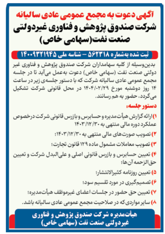 آگهی دعوت به مجمع عمومی عادی سالیانه شرکت صندوق پژوهش و فناوری غیردولتی صنعت نفت(سهامی خاص)