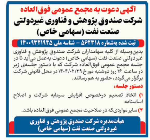 آگهی دعوت به مجمع عمومی فوقالعاده شرکت صندوق پژوهش و فناوری غیردولتی صنعت نفت (سهامی خاص)
