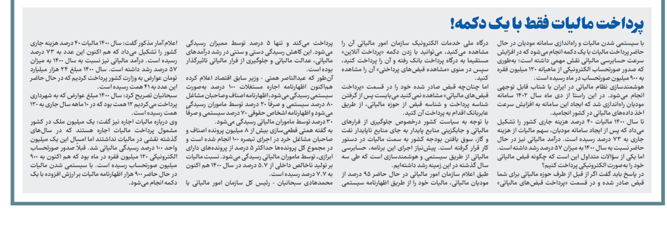 تا سال ۱۴۰۰ مالیات ۴۰ درصد هزینه جاری کشور را تشکیل میداد که پس از ایجاد سامانه مودیان، سهم مالیات از هزینه جاری به ۷۳ درصد رسیده است. درآمد مالیاتی نیز در حال حاضر نسبت به سال ۱۴۰۰ به میزان ۵۷ درصد رشد داشته است.اما یکی از سؤالات متداول این است که چگونه قبض مالیاتی خود را بهصورت الکترونیکی پرداخت کنیم؟