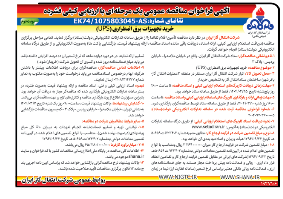 - 1- نام و نشانی مناقصهگزار: ستاد شرکت انتقال گاز ایران- واقع در خیابان ملاصدرا – خیابان پردیس - پلاک 3 2 -موضوع مناقصه: خرید تجهیزات برق اضطراری (UPS) 3 - محل تحویل کالا: انبار شرکت انتقال گاز ایران مستقر در منطقه 3عملیات انتقال گاز- باقر شهر/ ساختمان ستاد انتقال گاز به تشخیص خریدار 4- مهلت زمانی دریافت کاربرگهای استعلام ارزیابی کیفی و اسناد مناقصه: تا ساعت 16:00 روز پنجشنبه تاریخ 25/02/1404 ، فقط از طریق سامانه ستاد خواهد بود. 5- مهلت زمانی ارائه و بارگذاری کاربرگهای استعلام ارزیابی کیفی و اسناد مناقصه: تا ساعت 16:00 روز شنبه 10/03/1404، فقط از طریق سامانه ستاد توسط مناقصهگران بارگذاری شود. 6- شماره فراخوان مناقصه ثبت شده در سامانه تدارکات الکترونیکی دولت(ستاد): 2004092036000005 7- نحوه دریافت اسناد کاربرگهای استعلام ارزیابی کیفی: از طریق درگاه سامانه تدارکات الکترونیکی دولت(ستاد) به آدرس: www.setadiran.ir 8- نوع و مبلغ تضمین شرکت در فرآیند ارجاع کار: مطابق مصوبهشماره 123402/ت 50659 هـ تاریخ 22/09/1394 هیأت وزیران و اصلاحیه بعدی آن خواهد بود. 8-1 - مبلغ تضمین شرکت در فرآیند ارجاع کار میزان 000 000 264 3 ریال ومتناسب با انواع تضمینهای اعلام شده در آییننامه تضمین معاملات دولتی بهشماره 123402/ت 50659هـ تاریخ 22/09/1394(شرکتهای ایرانی در مقابل تضمین فرآیند ارجاع کار و تضامین انعقاد قرار داد ارزی – ریالی و ضمانتنامه پیش پرداخت مجاز هستند به جای ضمانتنامههای ارزی، ضمانتنامه ریالی بانکی معتبر براساس نرخ تسعیر (سامانه نظارت ارز) نیما در زمان تسلیم ارائه نمایند.در هر دوره دوازده ماهه که نرخ تسعیر ارز ده درصد افزایش داشته باشد میباید مبلغ ضمانتنامه بروز شده و کسری آن تحویل شرکت (خریدار) شود.) 9- اطلاعات تماس مناقصهگزار: مناقصهگران برای دریافت اطلاعات بیشتر یا داشتن هرگونه ابهام درخصوص اسنادمناقصه میباید درخواست خود را بهصورت مکتوب به نمابر شماره 81314177-021 ارسال نمایند. تبصره: اسناد ارزیابی کیفی و فنی، اسناد مناقصه و ارائه پیشنهاد قیمت بهصورت فشرده در بستر سامانه تدارکات الکترونیکی بارگذاری شده که مناقصهگر مجاز به دریافت آن خواهد بود. بنابراین مسؤولیت اطلاع از روند بارگذاری مناقصه و کنترلهای لازم بر عهده مناقصهگران میباشد. 10- گشایش پیشنهادها: پاکات پیشنهاد قیمت، ساعت09:00 روز یکشنبه تاریخ 11/03/1404 به نشانی تهران، خیابان ملاصدرا – خیابان پردیس - پلاک 3 – کمیسیون مناقصات بازگشایی خواهد شد. 11- سایر شرایط متقاضیان شرکت در مناقصه: 11-1- توانــایی تهیه و تسلیم ضمانتنــامه انجــام تعهدات به میــزان 10% کل مبلغ پیشنهادی(درصورت برنده شدن)، متناسب با انواع تضمینهای اعلام شده در آییننامه تضمین معاملات دولتی بهشماره 123402/ت50659 هـ تاریخ 22/09/1394 11-2 - مبلغ برآورد کارفرما: 000/ 000 /280 /65 ریال میباشد. 12- اطلاعات کلی مناقصه در پایگاه ملی اطلاعرسانی مناقصات کشور با کد فراخوان و سایت shana.ir موجود میباشد. 13- پاکات پیشنهاد نرخ مناقصهگرانی بازگشایی خواهد شد که براساس آییننامه اجریی بند ج ماده 12 قانون برگزاری مناقصات تأیید صلاحیت شده باشند.