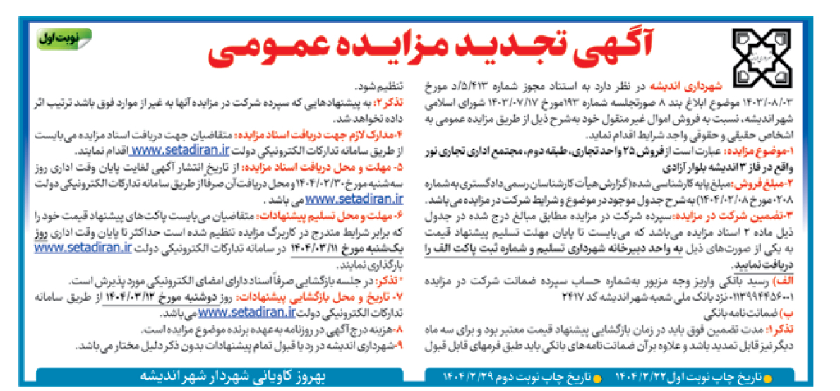 8-هزینه درج آگهی در روزنامه بهعهده برنده موضوع مزایده است.
