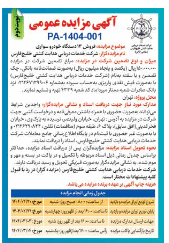 مدارک مورد نیاز جهت دریافت اسناد و نشانی مزایدهگزار: واجدین شرایط میتوانند بهصورت حضوری با همراه داشتن معرفینامه و درخواست کتبی جهت شرکت در مزایده به آدرس: تهران، خیابان ولیعصر، نرسیده به پارکوی، خیابان فخرالدینی(افق سابق)، پلاک 6، طبقه سوم (مناقصات) تلفن: 02126290824 و یا بهصورت غیر حضوری با ثبتنام در پایگاه اطلاعرسانی جامع معاملات شرکت خدمات دریایی هدایت کشتی خلیجفارس، اسناد را دریافت نمایند.