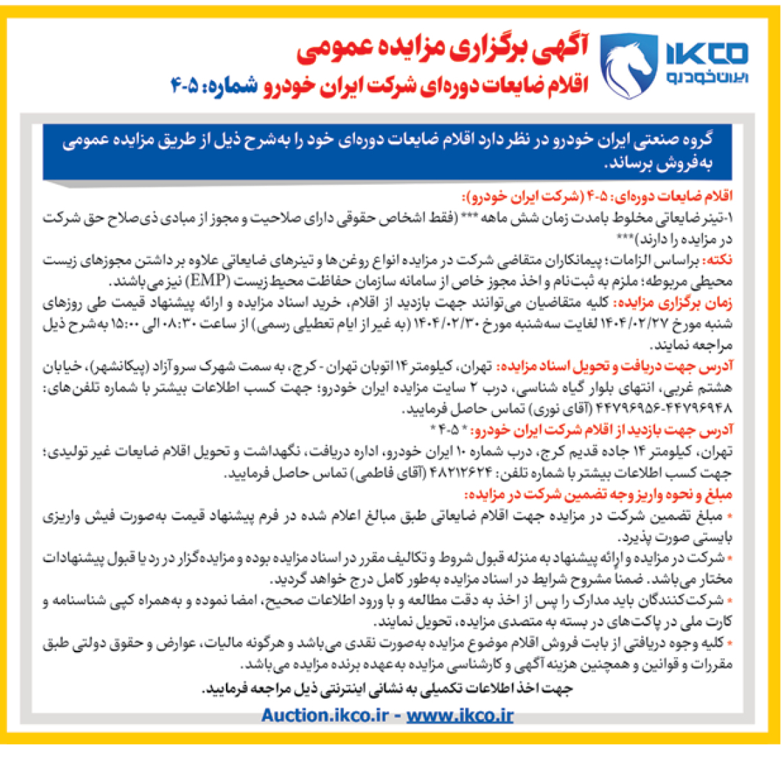 آگهی برگزاری مزایده عمومی اقلام ضایعات دورهای شرکت ایران خودرو شماره: ۵-۴