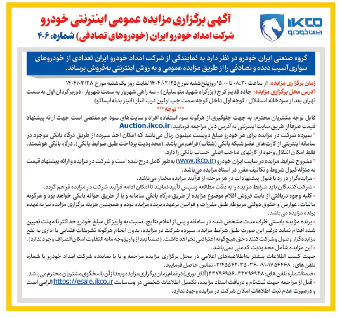 * مشروح شرایط مزایده در سایت ایران خودرو (www.ikco.ir) بهطور کامل درج شده است و شرکت در مزایده و ارائه پیشنهاد قیمت به منزله قبول شروط و تکالیف مقرر در اسناد مزایده میباشد.