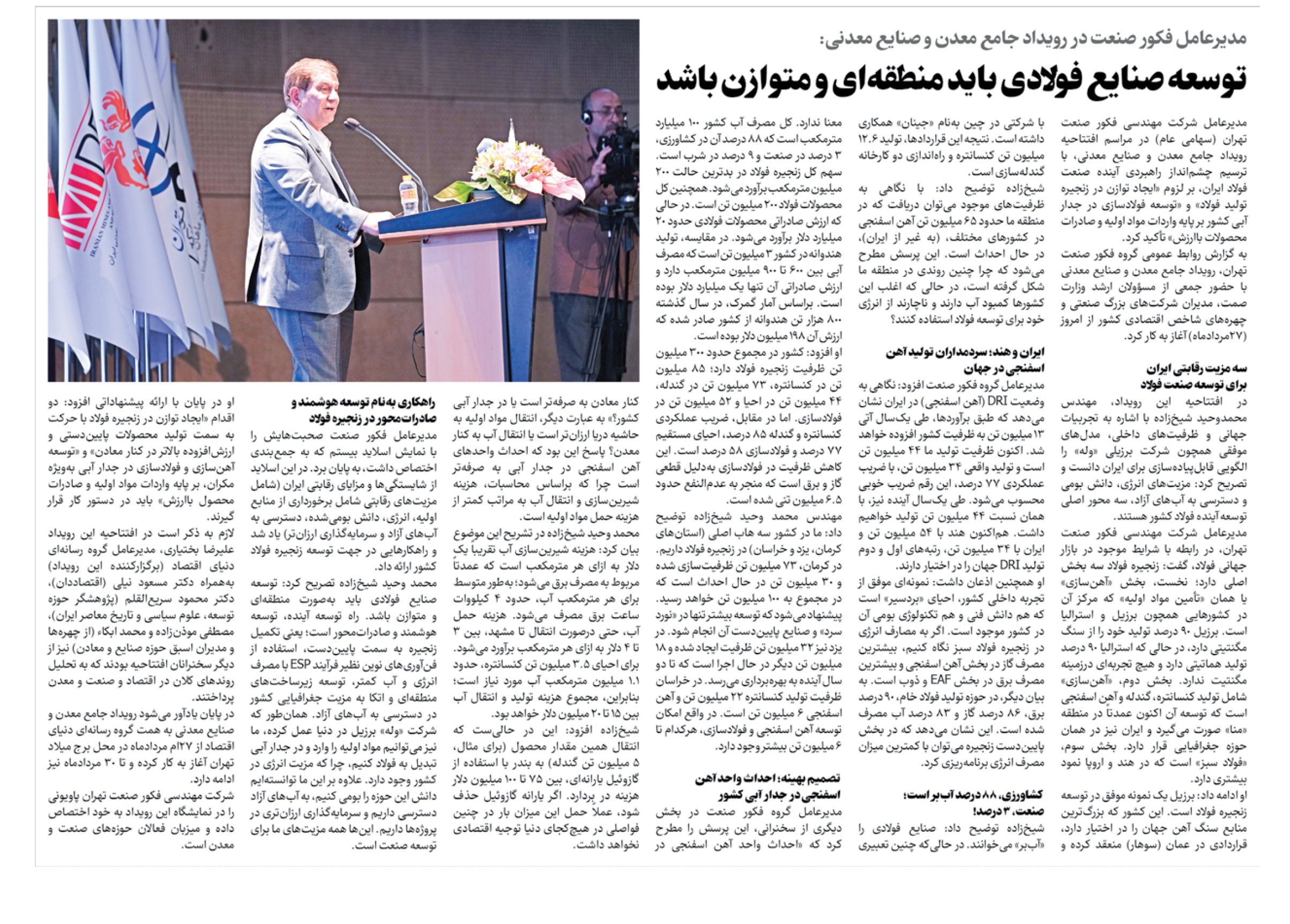 مدیرعامل شرکت مهندسی فکور صنعت تهران (سهامی عام) در مراسم افتتاحیه رویداد جامع معدن و صنایع معدنی، با ترسیم چشمانداز راهبردی آینده صنعت فولاد ایران، بر لزوم «ایجاد توازن در زنجیره تولید فولاد» و «توسعه فولادسازی در جدار آبی کشور بر پایه واردات مواد اولیه و صادرات محصولات باارزش» تأکید کرد.