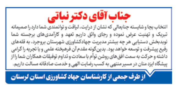 انتخاب بجا و شایسته جنابعالی که نشان از درایت، لیاقت و توانمندی شما دارد را صمیمانه تبریک و تهنیت عرض نموده و رجای واثق داریم تعهد و کارآمدیهای برجسته شما نویدبخش دستیابی هر چه بیشتر مدیریت جهادکشاورزی شهرستان بروجرد، به قلههای رفیع پیشرفت و توسعه خواهد بود. بدینگونه مقدم آن فرهیخته علمی و با تجربه را گرامی داشته و حرکت به سمت افقهای روشن توأم با سعادت و تداوم توفیقات همکاران شما را از پیشگاه ایزد منان در مسیر منتهی به کسب رضایت الهی و خدمت صادقانه مسالت داریم.