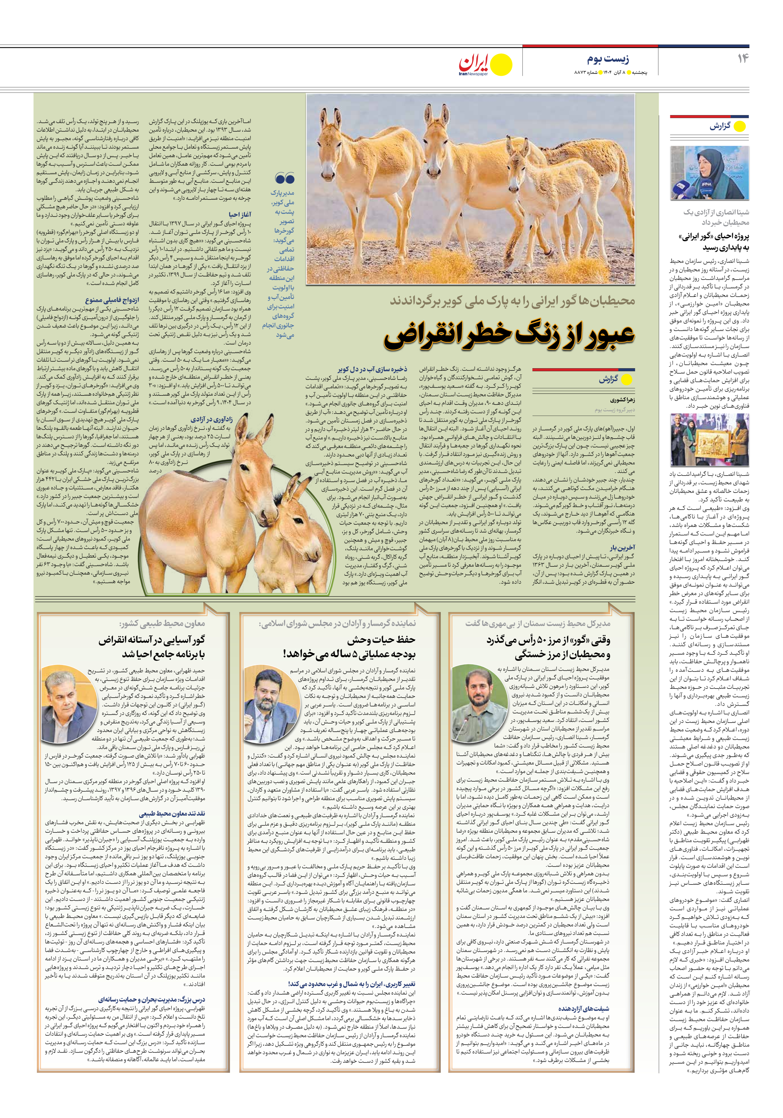 وی با اشاره به تلاش مستمر سازمان حفاظت محیط زیست برای رفع این مشکلات افزود: «اگرچه مسائل کشور در برخی موارد پیچیده است و ممکن است گاهی این زحمات بهطور کامل دیده نشود، اما با درایت، هدایت و همراهی همه همکاران و بویژه با نگاه حمایتی مدیران ارشد، میتوان بر این مشکلات غلبه کرد.» یوسفپور درباره احیای گور ایرانی گفت: «طی چندین سال بنای احیای گور ایرانی گذاشته شد؛ تلاشی که مدیران سابق مجموعه و محیطبانان منطقه بویژه «رضا شاهحسینیمقدم» به عنوان رئیس پارک ملی کویر، باعث شد. امروز جمعیت گور ایرانی در پارک ملی کویر از مرز ۵۰ رأس گذشته و این گونه عملاً احیا شده است. بخش پنهان این موفقیت، زحمات طاقتفرسای محیطبانان عزیز بوده است.