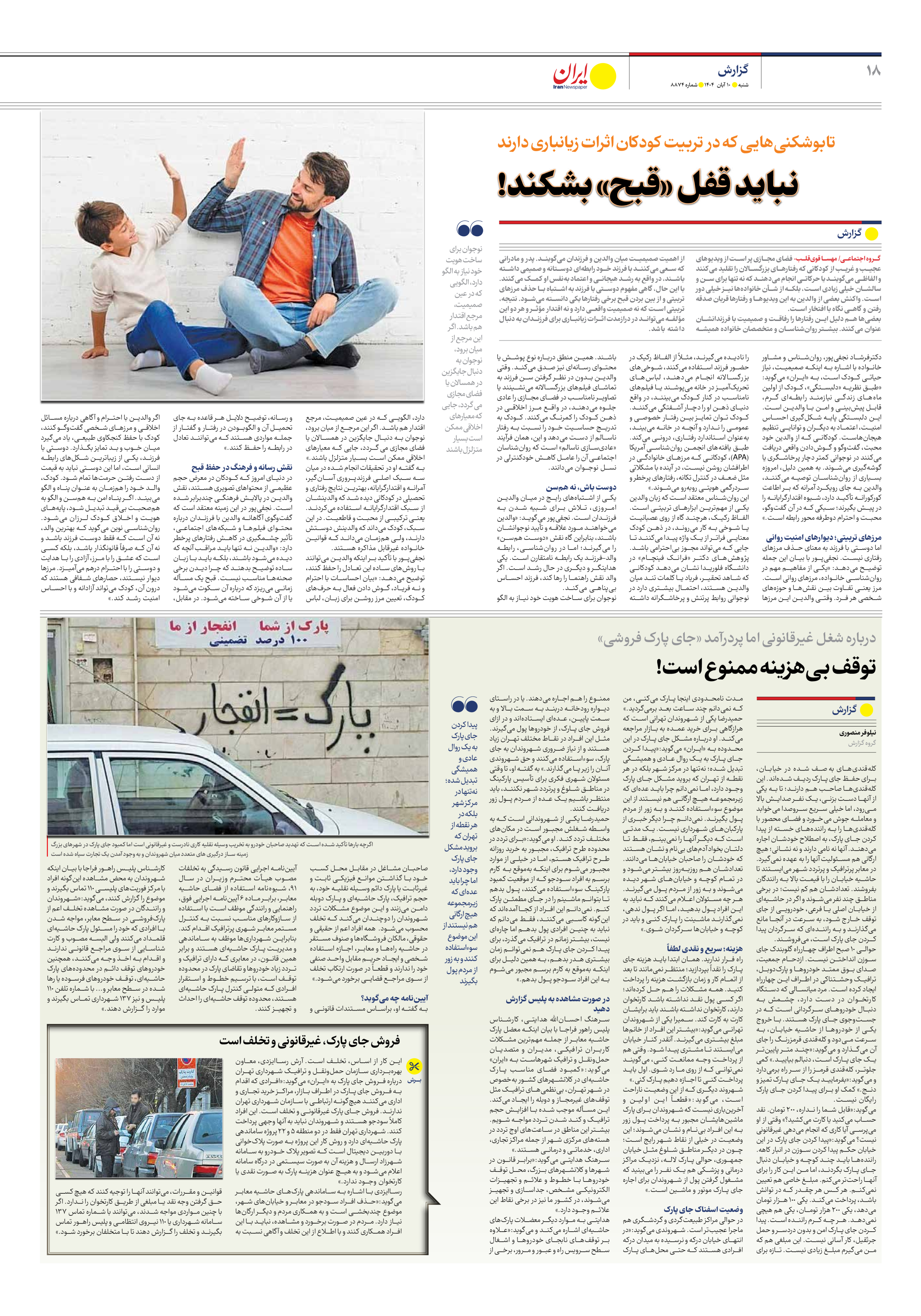 میگوید:«قابل شما را نداره، 200 تومان. نقد حساب میکنید یا کارت میکشید؟» وقتی از او میپرسی آیا کاری که انجام میدهی غیرقانونی نیست؟ میگوید:«پیدا کردن جای پارک در این خیابان حکم پیدا کردن سوزن در انبار کاهه. رانندهها باید چند کوچه و خیابان دنبال جای پارک بگردند، اما من این کار را برای آنها راحتتر میکنم. مبلغ خاصی هم تعیین نمیکنم. هر کس هر چقدر که در توانش باشد، پرداخت میکند. یکی 100 هزار تومان میدهد، یکی 200 هزار تومان، یکی هم هیچی نمیدهد. هر چه کرم راننده است. پیدا کردن جای پارک امن و بدون دردسر و حمل جرثقیل، کار آسانی نیست. این مبلغی هم که من میگیرم مبلغ زیادی نیست. تازه برای مدت نامحدودی اینجا پارک میکنی، من که نمیدانم چند ساعت بعد برمیگردید.»