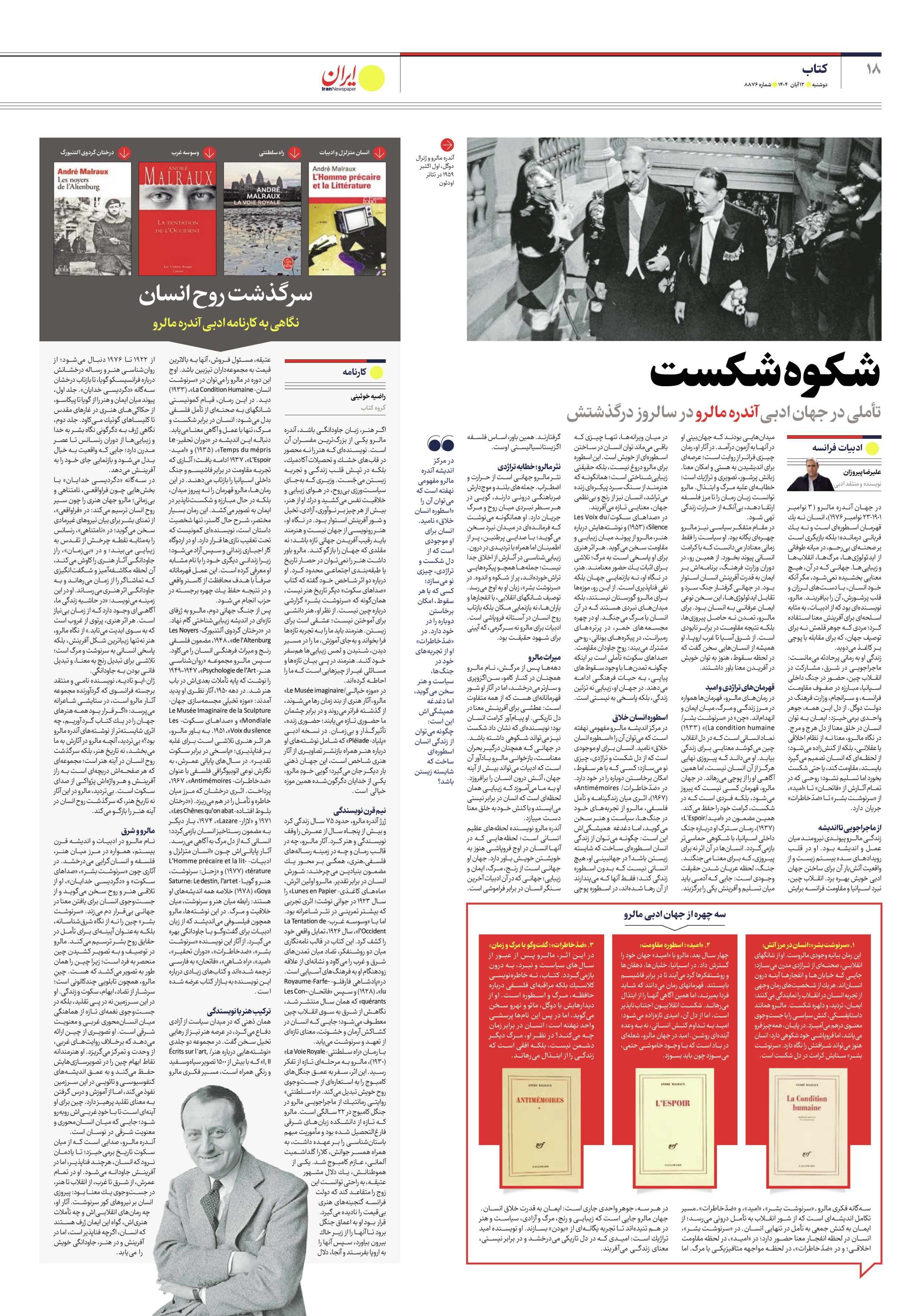 آندره مالرو نویسنده لحظههای عظیم انسانی است؛ لحظههایی كه در آنها انسان در اوج فروپاشی هنوز به خویشتن خویش باور دارد. جهان او جهانی است از رنج، مرگ، ایمان و زیبایی؛ جهانی كه در آن ادبیات آخرین سنگر انسان در برابر فراموشی است.