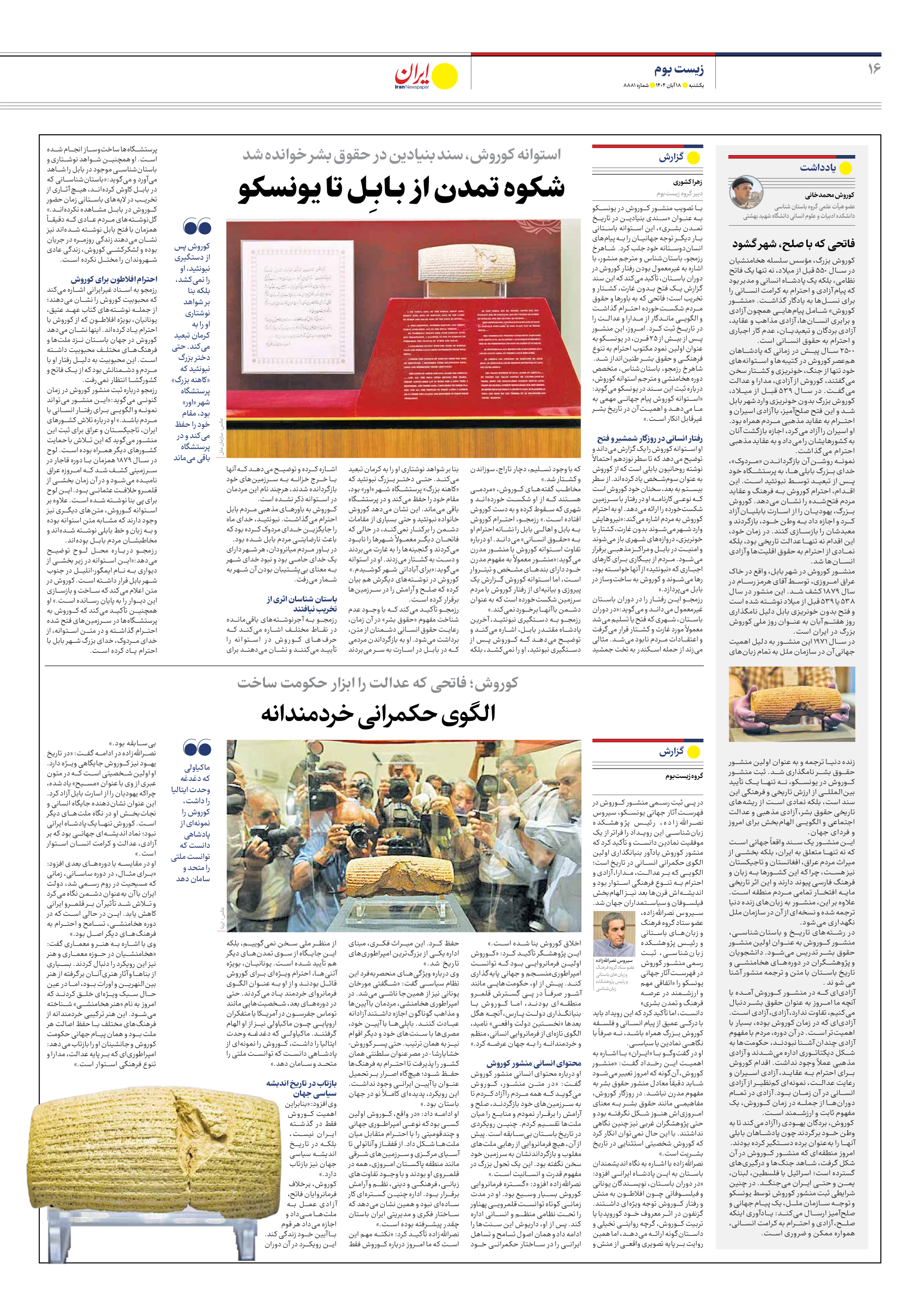 ۲۵۰۰ سال پیش در زمانی که پادشاهان همعصر کوروش در کتیبهها و استوانههای خود تنها از جنگ، خونریزی و کشتار سخن میگفتند، کوروش از آزادی، مدارا و عدالت میگفت. در سال ۵۳۹ قبل از میلاد، کوروش بزرگ بدون خونریزی وارد شهر بابل شد و این فتح صلحآمیز، با آزادی اسیران و احترام به عقاید مذهبی مردم همراه بود. او اسیران را آزاد میکرد، اجازه بازگشت آنان به کشورهایشان را میداد و به عقاید مذهبی احترام میگذاشت.