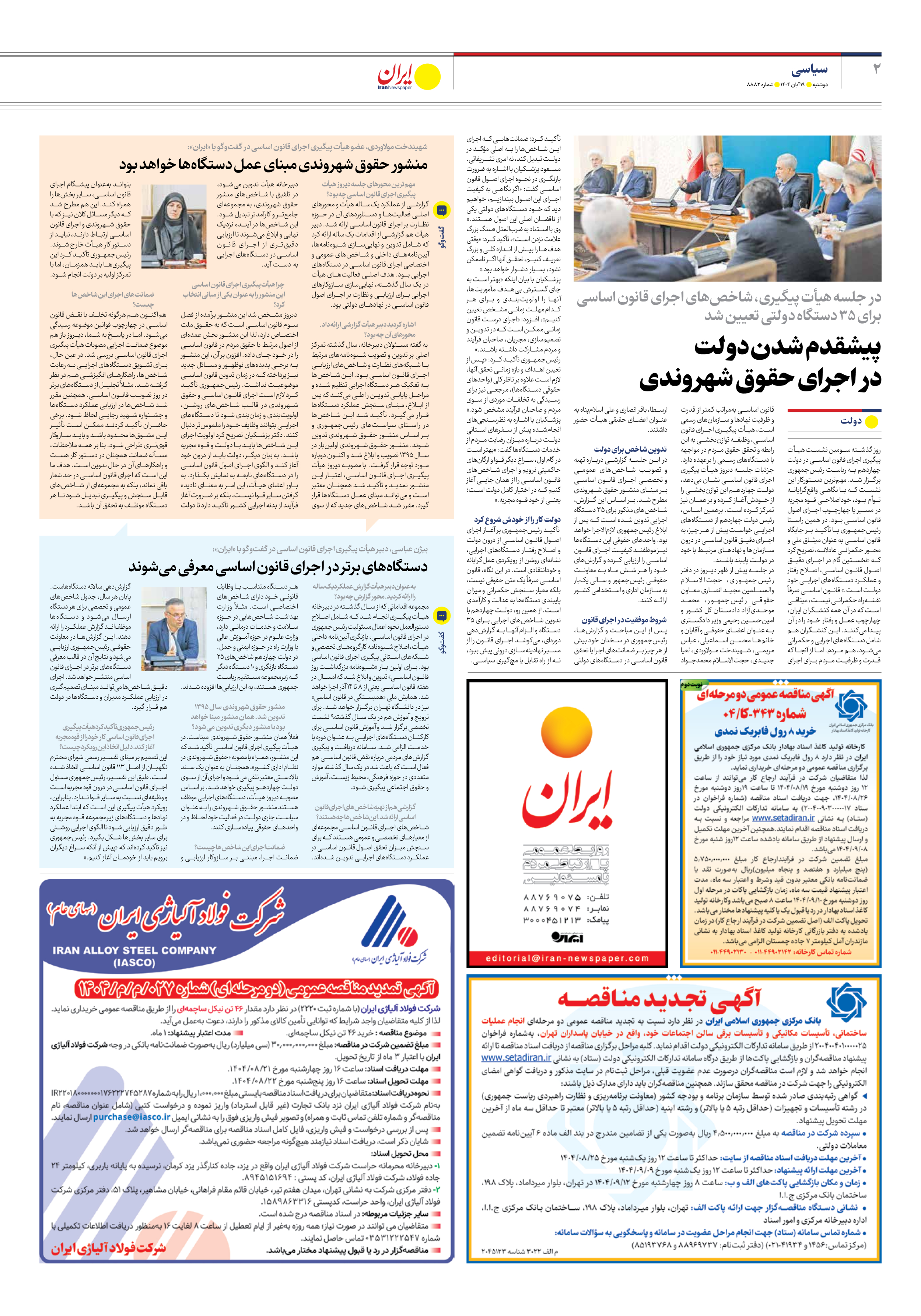 روز گذشته سومین نشست هیأت پیگیری اجرای قانون اساسی در دولت چهاردهم به ریاست رئیسجمهوری برگزار شد. مهمترین دستورکار این نشست که با نگاهی واقعگرایانه توأم بود، خوداصلاحی قوه مجریه در مسیر یا چهارچوب اجرای اصول قانون اساسی بود. در همین راستا رئیسجمهوری با تأکید بر جایگاه قانون اساسی به عنوان میثاق ملی و محور حکمرانی عادلانه، تصریح کرد که «نخستین گام در اجرای دقیق اصول قانون اساسی، اصلاح رفتار و عملکرد دستگاههای اجرایی خود دولت است.» قانون اساسی صرفاً نقشهراه حکمرانی نیست، میثاقی است که در آن همه کنشگران ایران، چهارچوب عمل و رفتار خود را در آن پیدا میکنند. این کنشگران هم شامل دستگاههای اجرایی و حکمرانی میشود، هم مردم. اما از آنجا که قدرت و ظرفیت مردم برای اجرای قانون اساسی بهمراتب کمتر از قدرت و ظرفیت نهادها و سازمانهای رسمی است، هیأت پیگیری اجرای قانون اساسی، وظیفه توازنبخشی به این رابطه و تحقق حقوق مردم در مواجهه با دستگاههای رسمی را برعهده دارد. جزئیات جلسه دیروز هیأت پیگیری اجرای قانون اساسی نشان میدهد، دولت چهاردهم این توازنبخشی را از خودش آغاز کرده و بر همان نیز تمرکز کرده است. برهمین اساس، رئیس دولت چهاردهم از دستگاههای اجرایی خواست پیش از هر چیز، به اجرای دقیق قانون اساسی در درون سازمانها و نهادهای مرتبط با خود در دولت پایبند باشند.