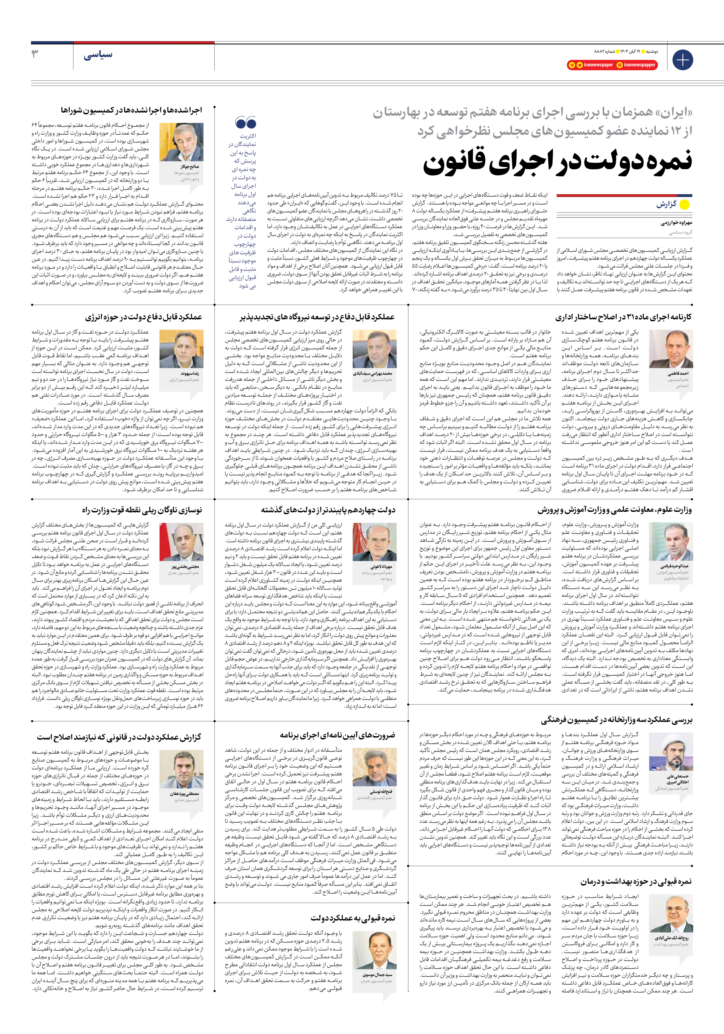 گزارش ارزیابی کمیسیونهای تخصصی مجلس شورای اسلامی از عملکرد یکساله دولت چهاردهم در اجرای برنامه هفتم پیشرفت، امروز و فردا در جلسات علنی مجلس قرائت میشود. محتوای این گزارشها به عنوان ارزیابی نهاد ناظر، نشان خواهد داد که هر یک از دستگاههای اجرایی تا چه حد توانستهاند به تکالیف و تعهدات مشخص شده در قانون برنامه هفتم پیشرفت عمل کنند یا اینکه نقاط ضعف و قوت دستگاههای اجرایی در این حوزهها چه بوده است و در مسیر اجرا با چه موانعی مواجه بوده یا هستند. گزارش «شورای راهبری برنامه هفتم پیشرفت» از عملکرد یکساله دولت ۸ مهرماه تقدیم مجلس و در جلسه علنی فوقالعاده نمایندگان بررسی شد. این گزارشها در فرصت ۴۰ روزه، با حضور وزرا و معاونان وزرا در کمیسیونهای تخصصی به تفصیل بررسی شد. هفته گذشته محسن زنگنه سخنگوی کمیسیون تلفیق برنامه هفتم، در گزارشی از جمعبندی این بررسیها، با یادآوری اینکه ارزیابی کمیسیونها مربوط به میزان تحقق برش اول یکساله و یک پنجم یا ۲۰ درصد برنامه است، گفت: «برخی کمیسیونها اعلام رضایت ۵۵ درصدی و برخی نیز به تحقق ۲۰ درصدی اهداف برنامه اشاره کردهاند. لذا با در نظر گرفتن همه آمارهای موجود، میانگین تحقق اهداف در سال اول بین نهایتاً ۳۰ تا ۳۵ درصد برآورد میشود.» به گفته زنگنه، ۷۰ تا ۷۵ درصد تکالیف مربوط به تدوین آییننامههای اجرایی برنامه هم انجام شده است. با وجود این، گفتوگوهایی که «ایران» طی حدود ۲۰ روز گذشته در راهروهای مجلس با نمایندگان عضو کمیسیونهای تخصصی داشت، نشان میدهد اگرچه ارزیابیهای متفاوتی نسبت به عملکرد دستگاههای اجرایی در عمل به تکالیفشان وجود دارد، اما اکثریت نمایندگان در پاسخ به اینکه چه نمرهای به دولت در اجرای سال اول برنامه میدهند، نگاهی توأم با رضایت و انصاف دارند. در نگاه این نمایندگان از کمیسیونهای مختلف مجلس، اقدامات دولت در چهارچوب ظرفیتهای موجود و شرایط فعلی کشور، نسبتاً مثبت و قابل قبول ارزیابی میشود. همچنین آنان اصلاح برخی از اهداف و مواد برنامه را به شرط اثبات غیرقابل تحقق بودن آنها از سوی دولت، ضروری دانسته و معتقدند در صورت ارائه لایحه اصلاحی از سوی دولت مجلس با این تغییر همراهی خواهد کرد.