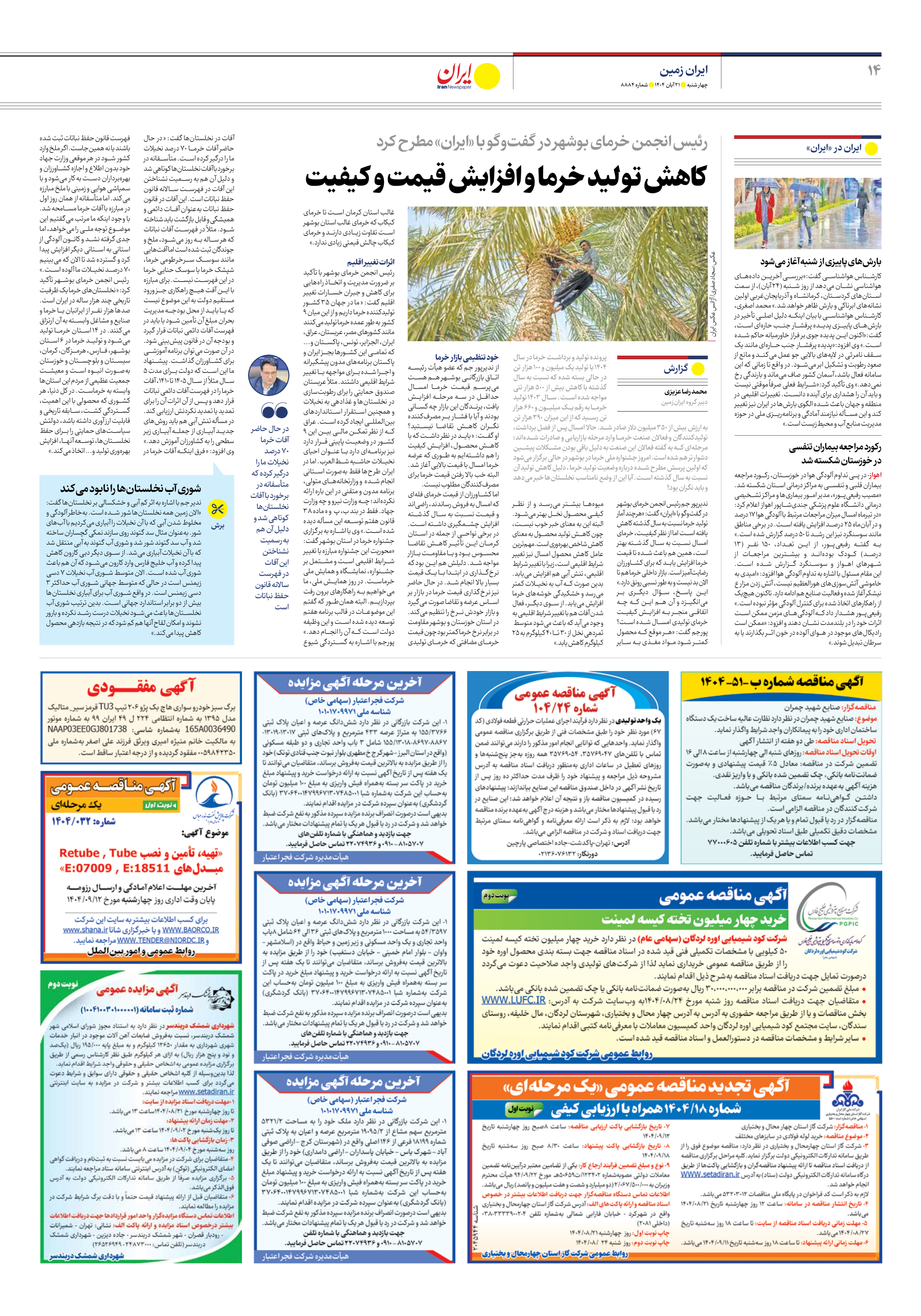 کارشناس هواشناسی گفت:«بررسی آخرین دادههای هواشناسی نشان میدهد از روز شنبه (۲۴ آبان)، از سمت استانهای کردستان، کرمانشاه و آذربایجانغربی اولین نشانههای ابرناکی و بارش ظاهر خواهد شد.» محمد اصغری، کارشناس هواشناسی با بیان اینکه دلیل اصلی تأخیر در بارشهای پاییزی پدیده پرفشار جنب حارهای است، گفت:«اکنون این پدیده جوی بر فراز خاورمیانه حاکم شده است.» وی افزود:«پدیده پرفشار جنب حارهای مانند یک سقف نامرئی در لایههای بالایی جو عمل میکند و مانع از صعود رطوبت و تشکیل ابر میشود. در واقع تا زمانی که این سامانه فعال باشد، آسمان کشور صاف میماند و بارندگی رخ نمیدهد.» وی تأکید کرد:«شرایط فعلی صرفاً موقتی نیست و باید آن را هشداری برای آینده دانست. تغییرات اقلیمی در منطقه و جهان باعث شده الگوی بارشها در ایران نیز تغییر کند و این مسأله نیازمند آمادگی و برنامهریزی ملی در حوزه مدیریت منابع آب و محیطزیست است.»