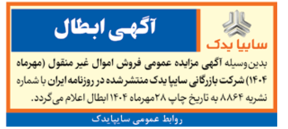در حافظه موقت ذخیره شد... تصویر آگهـی ابـطال سایپا ۲۱ آبان ۱۴۰۴ شماره هشت هزار و هشتصد و هشتاد و چهار - صفحه ۷ بدینوسیله آگهی مزایده عمومی فروش اموال غیر منقول (مهرماه 1404) شرکت بازرگانی سایپا یدک منتشر شده در روزنامه ایران با شماره نشریه 8864 به تاریخ چاپ 28مهرماه 1404 ابطال اعلام میگردد.