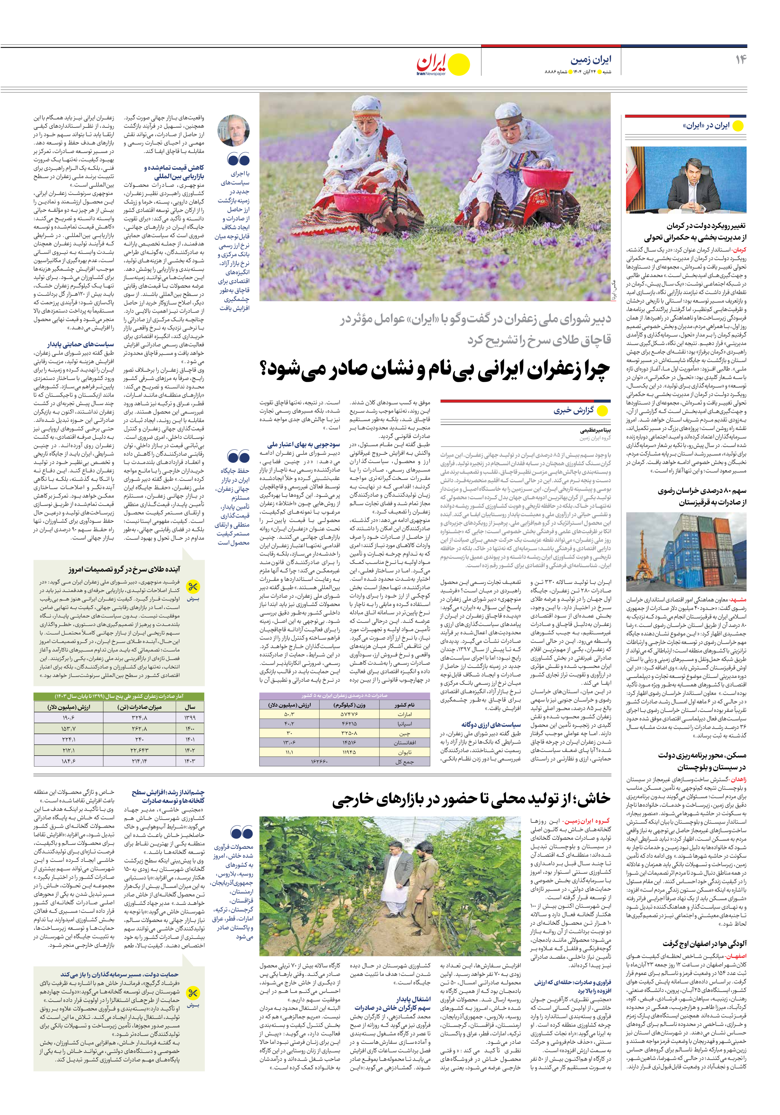 ایران با تولید سالانه ۳۳۰ تن و صادرات ۲۸۰ تن زعفران، جایگاه اول جهان را در تولید و عرضه طلای سرخ در اختیار دارد. با این وجود، بخش عمدهای از سود اقتصادی زعفران بهدلیل قاچاق و صادرات غیرمستقیم، به جیب کشورهای واسطه میرود. این در حالی است که زعفران، یکی از مهمترین اقلام صادراتی غیرنفتی در بخش کشاورزی ایران محسوب شده و نقش مؤثری در ارزآوری و تقویت تراز تجاری کشور ایفا میکند.