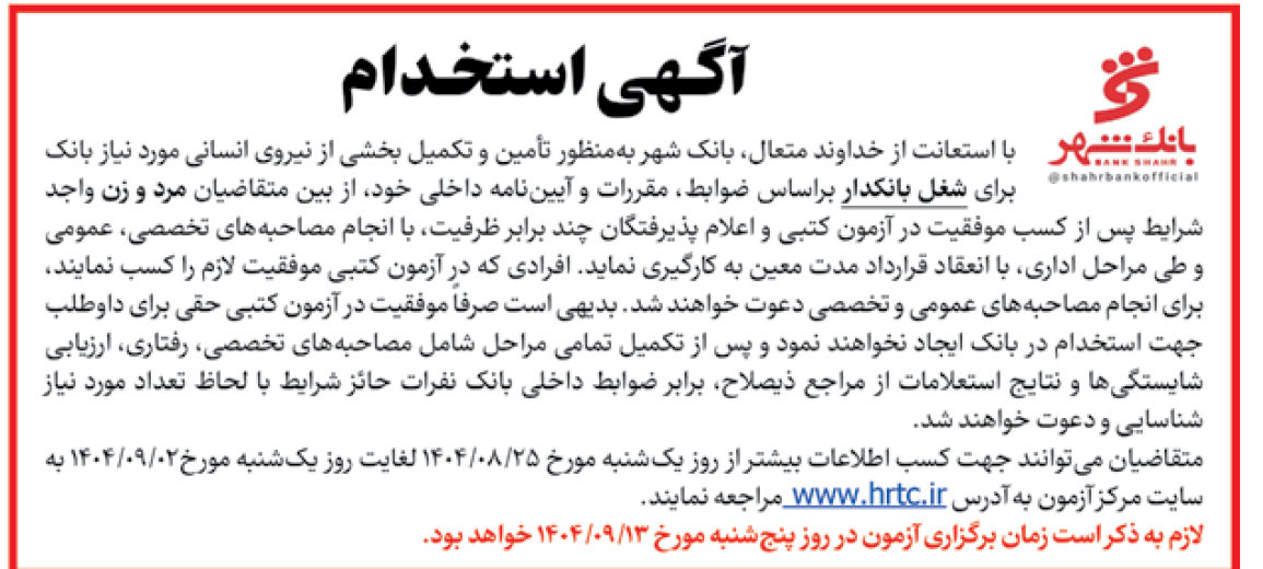 متقاضیان میتوانند جهت کسب اطلاعات بیشتر از روز یکشنبه مورخ 25/08/1404 لغایت روز یکشنبه مورخ02/09/1404 به سایت مرکز آزمون به آدرس www.hrtc.ir مراجعه نمایند.
