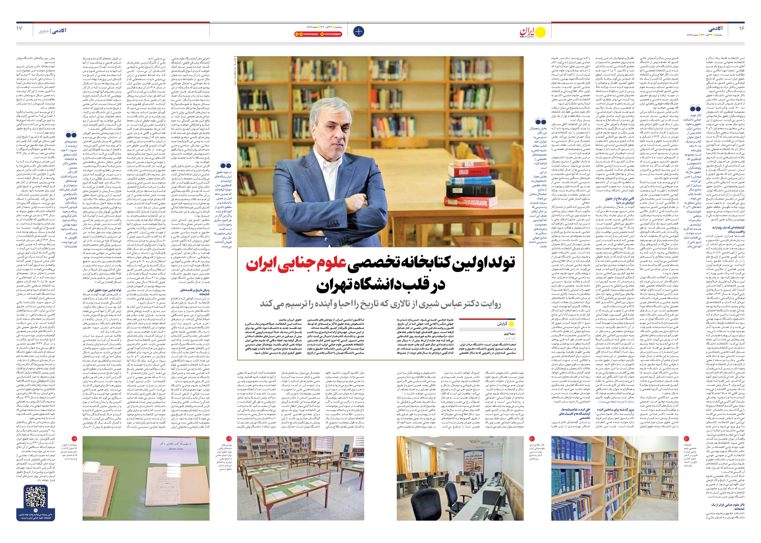 اینجا دانشگاه تهران است؛ دانشگاه مادر ایران. در سکوت نیمروز پاییزیِ دانشکده حقوق و علوم سیاسی، قدمزدن در راهرویی که به تالار تخصصی علوم جنایی ختم میشود، حس وارد شدن به جهانی دیگر را القا میکند؛ جهانی که در آن، تاریخ، قانون و روایتِ یک قرن تلاش علمی در کنار هم قرار گرفته است. بوی کاغذهای کهنه با عطر جلدهای تازه، درآمیخته و نور ملایم خورشید روی کتابهایی میتابد که چند جلد از آنها بیش از ۸۰ سال عمر دارند و تعدادی دیگر هنوز گرمِ چاپ جدید هستند. قفسههای چوبی که به دقت مرتب شدهاند، هر کدام گویی دروازهای به سالهای دورند؛ از مشروطه تا قانون اساسی ایران، از پژوهشهای نخستین دانشجویان رشته حقوق تا آثار برجستهای که توسط شخصیتهای تأثیرگذار کشور نگاشته شدهاند. در این میان، چهرهای آرام اما پرانرژی با دقت و عشق، رد تکتک کتابها را دنبال میکند؛ دکتر عباس شیری. کسی که امروز نامش کنار نخستین «کتابخانه تخصصی علوم جنایی ایران» ثبت شده و بیراه نیست اگر این رئیس دانشکده حقوق و علوم سیاسی دانشگاه تهران را احیاگر بخشی از تاریخ حقوق ایران بنامیم. ساخت این کتابخانه، صرفاً افزودن یک سالن و چند قفسه جدید به دانشکده نبود؛ تلاشی بود برای پاسخ دادن به یک خلأ دیرینه و آرزویی که شاید بیش از نیم قرن در ذهن نسلهای مختلف استادان شکل گرفته بود؛ ایجاد مکانی که علوم جنایی ایران بتواند نفس تازهای بکشد، پژوهشگر جوان دسترسی مستقیم به منابع بنیادین داشته باشد و چهره واقعی حقوق کیفری ایران به درستی نمایان شود.