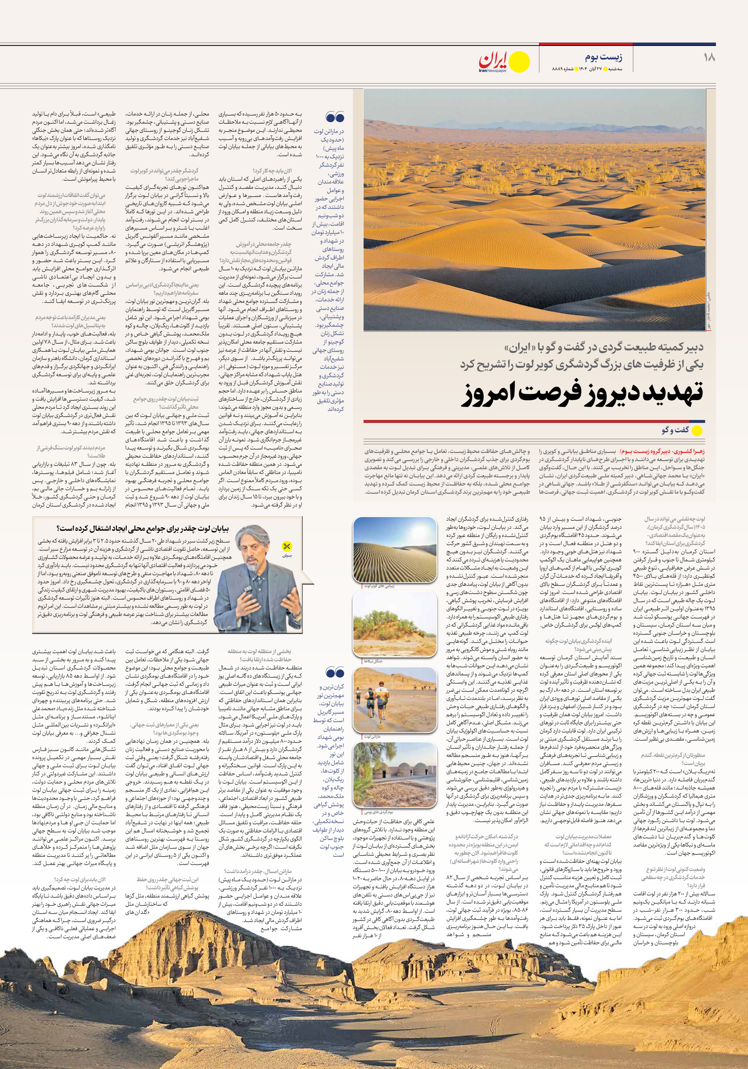 زهرا کشوری- دبیر گروه زیست بوم/ بسیاری مناطق بیابانی و کویری را تهدیدی برای توسعه میدانند و با اجرای طرحهای ناپایدار گردشگری در جنگلها و سواحل، این مناطق را تخریب میکنند. با این حال، گفتوگوی «ایران» با محمد جهانیشاهی، دبیر کمیته ملی طبیعتگردی ایران، نشان میدهد که بیابان میتواند «سنگفرشی از طلا» باشد. جهانیشاهی در گفتوگو با ما نقش کویر لوت در گردشگری، اهمیت ثبت جهانی، فرصتها و چالشهای حفاظت محیطزیست، تعامل با جوامع محلی و ظرفیتهای بومگردی برای جذب گردشگران داخلی و خارجی را بررسی میکند و تصویری کامل از تلاشهای علمی، مدیریتی و فرهنگی برای تبدیل لوت به مقصدی پایدار و برجسته طبیعت گردی ارائه میدهد. این بیابان نه تنها مانع مهاجرت جوامع محلی شده، بلکه به حفاظت از محیط زیست کمک کرده و تهدید طبیعی خود را به مهمترین برند گردشگری استان کرمان تبدیل کرده است.