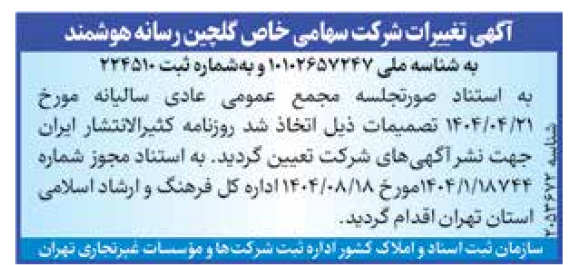 به استناد صورتجلسه مجمع عمومی عادی سالیانه مورخ 1404/04/21 تصمیمات ذیل اتخاذ شد روزنامه کثیرالانتشار ایران جهت نشر آگهیهای شرکت تعیین گردید. به استناد مجوز شماره 1404/1/18744مورخ 1404/08/18 اداره کل فرهنگ و ارشاد اسلامی استان تهران اقدام گردید.