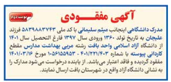 مدرک دانشگاهی اینجانب میثم سلیمانی با کد ملی ۵۸۳۹۸۸۳۷۴۳ فرزند علیجان به تاریخ تولد ۱۳۶۰ ورودی سال ۱۳۹۷ فارغ التحصیل سال ۱۴۰۱ از دانشگاه آزاد اسلامی واحد بافت رشته مربی بهداشت مدارس مقطع کاردانی پیوسته با شماره ۴۰۱/۲۲۱/۴۰۳ - ۱۰۵۶۱۵۵۹۵۳ مورخ 16/03/1401 مفقود گردیده و فاقد اعتبار میباشد. از یابنده درخواست میشود مدارک را به نشانی دانشگاه آزاد واقع در شهرستان بافت ارسال نمایند.
