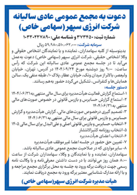 بدینوسیله از کلیه سهامداران، نماینده و یا نمایندگان اشخاص حقوقی و وکلا اشخاص حقیقی، شرکت انرژی سپهر (سهامی خاص) دعوت بهعمل میآید تا در جلسه مجمع عمومی عادی سالیانه این شرکت که رأس ساعت: 9:00 روز دوشنبه مورخ 24/09/1404 در آدرس: تهران، خیابان ولیعصر، بالاتر از میدان ونک، خیابان عطار، پلاک 10، طبقه منفی یک، سالن همایشها و کنفرانس، تشکیل میگردد حضور بههم رسانند.