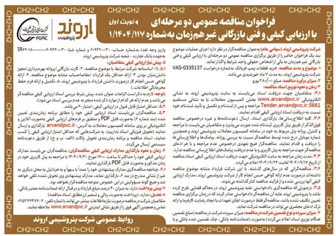 متقاضیان شرکت در مناقصه درصورت نیاز بهاطلاعات بیشتر، میتوانند با شماره تلفن: 7 - 06152126476 تماس و همچنین آگهی فوق را از طریق نشانی اینترنتی www.arvandpvc.ir ملاحظه نمایند.