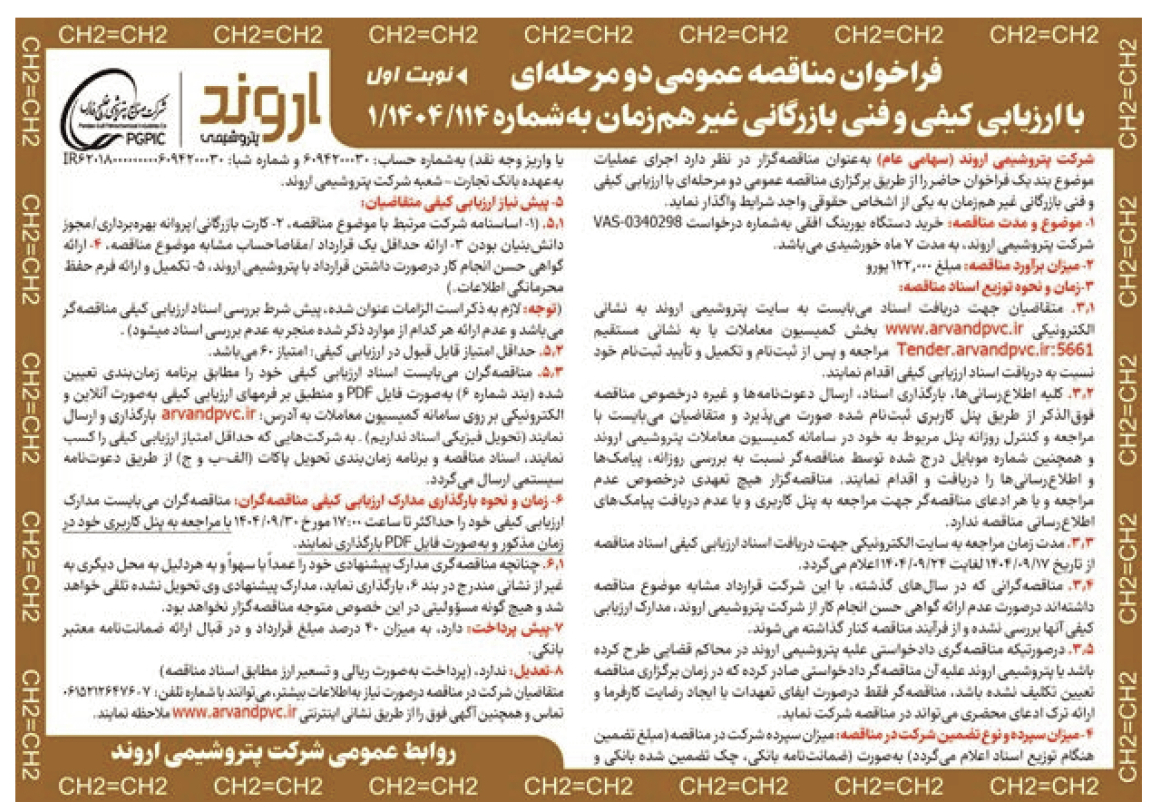 متقاضیان شرکت در مناقصه درصورت نیاز بهاطلاعات بیشتر، میتوانند با شماره تلفنها: 06152126677 -06152126476 تماس و همچنین آگهی فوق را از طریق نشانی اینترنتی www.arvandpvc.ir ملاحظه نمایند.