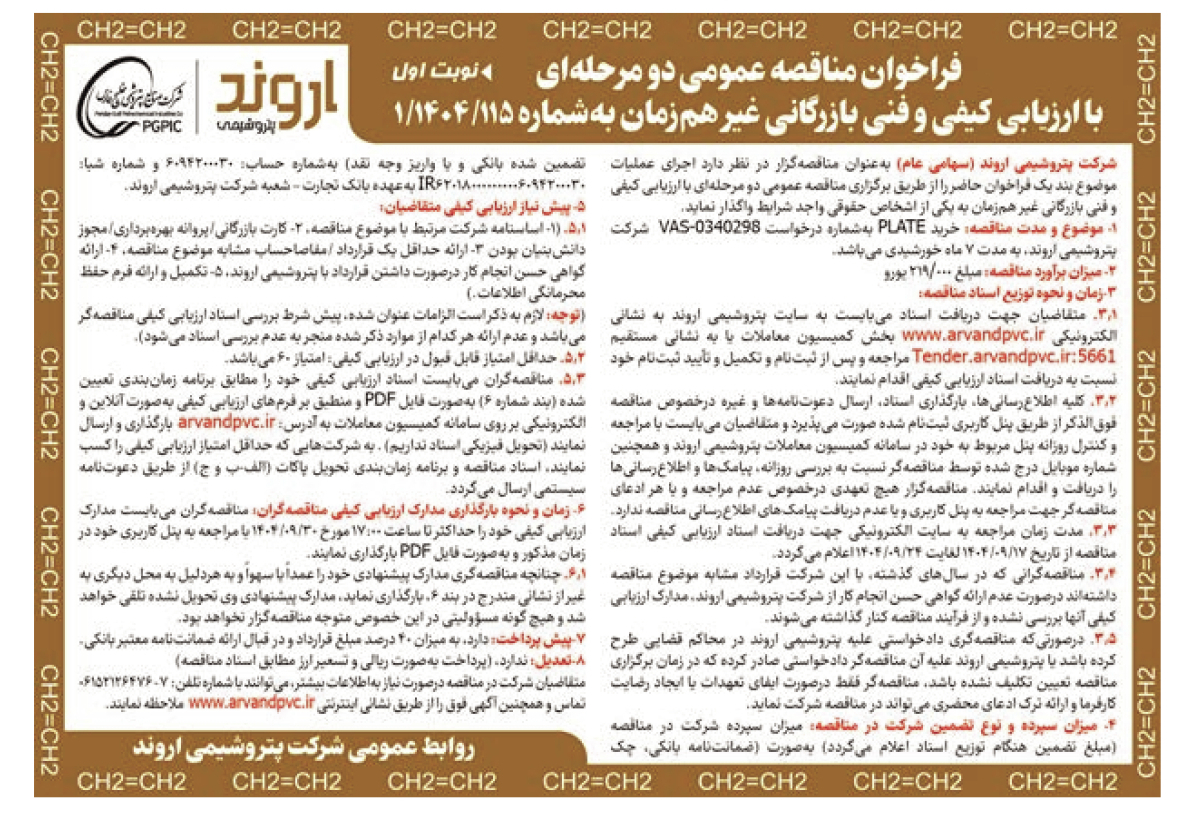 1- موضوع و مدت مناقصه: خرید PLATE بهشماره درخواست VAS-0340298 شرکت پتروشیمی اروند، به مدت 7 ماه خورشیدی میباشد.