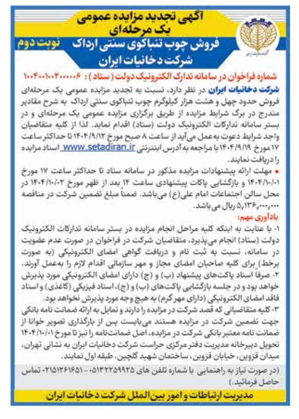 واجد شرایط دعوت بهعمل میآید از ساعت 8 صبح مورخ 12/9/1404 تا حداکثر ساعت 17 مورخ 19/9/1404 با مراجعه به آدرس اینترنتی www.setadiran.ir اسناد مزایده را دریافت نمایند.