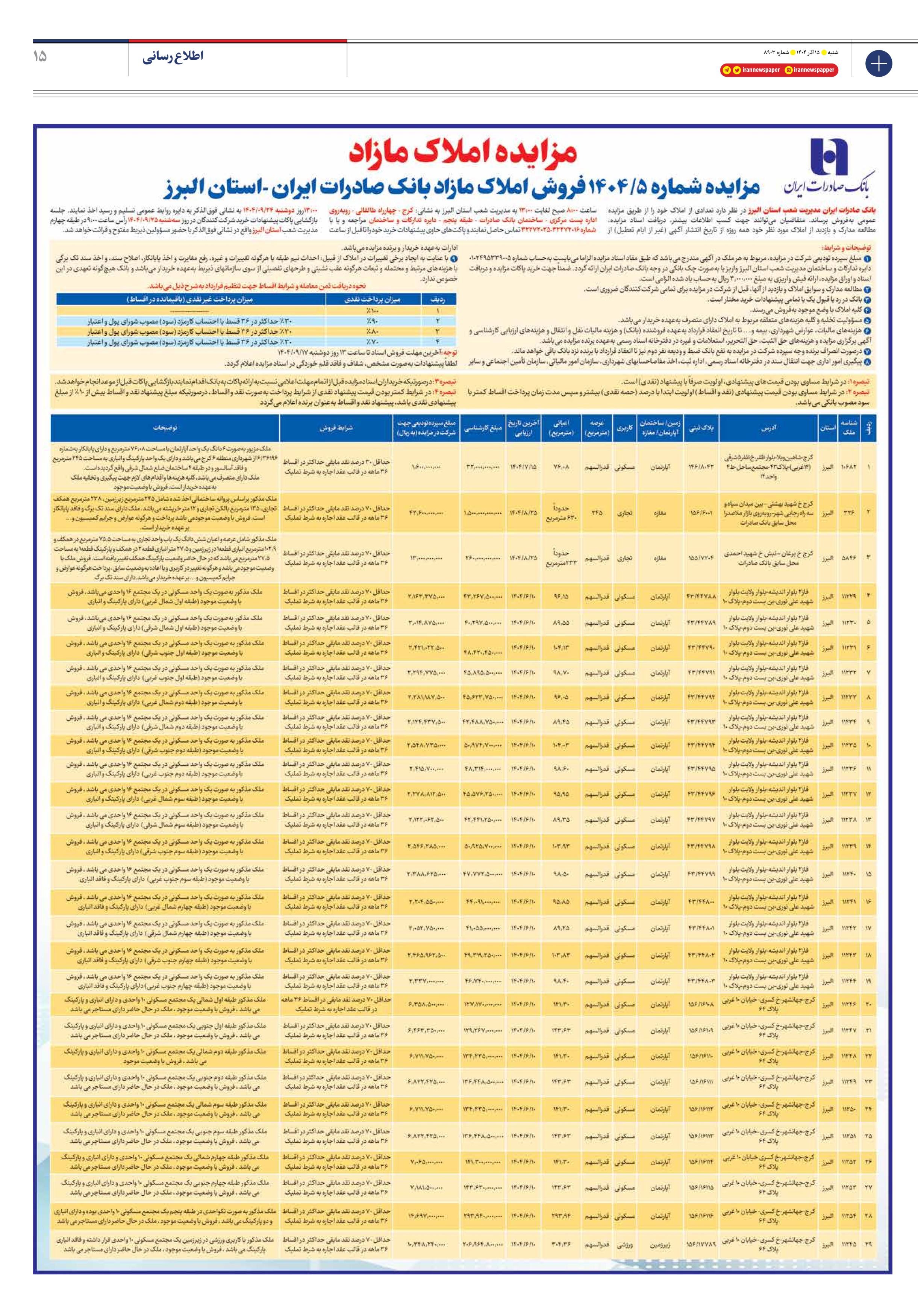 مزایده شماره ۱۴۰۴/۵ فروش املاک مازاد بانک صادرات ایران -استان البرز