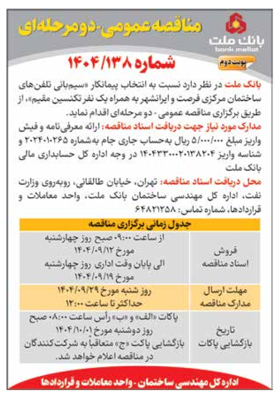 محل دریافت اسناد مناقصه: تهران، خیابان طالقانی، روبهروی وزارت نفت، اداره کل مهندسی ساختمان بانک ملت، واحد معاملات و قراردادها، شماره تماس: 64821258