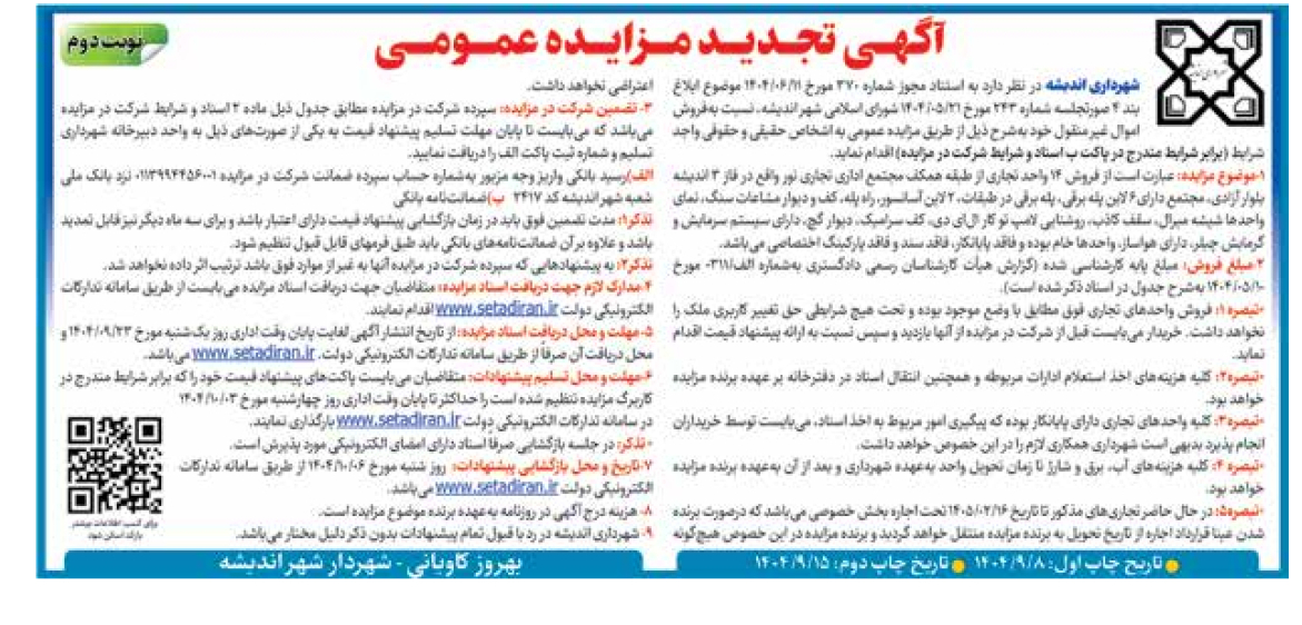 1-موضوع مزایده: عبارت است از فروش 14 واحد تجاری از طبقه همکف مجتمع اداری تجاری نور واقع در فاز 3 اندیشه بلوار آزادی، مجتمع دارای6 لاین پله برقی، پله برقی در طبقات، 2 لاین آسانسور، راه پله، کف و دیوار مشاعات سنگ، نمای واحدها شیشه میرال، سقف کاذب، روشنایی لامپ تو کار الای دی، کف سرامیک، دیوار گچ، دارای سیستم سرمایش و گرمایش چیلر، دارای هواساز، واحدها خام بوده و فاقد پایانکار، فاقد سند و فاقد پارکینگ اختصاصی میباشد.