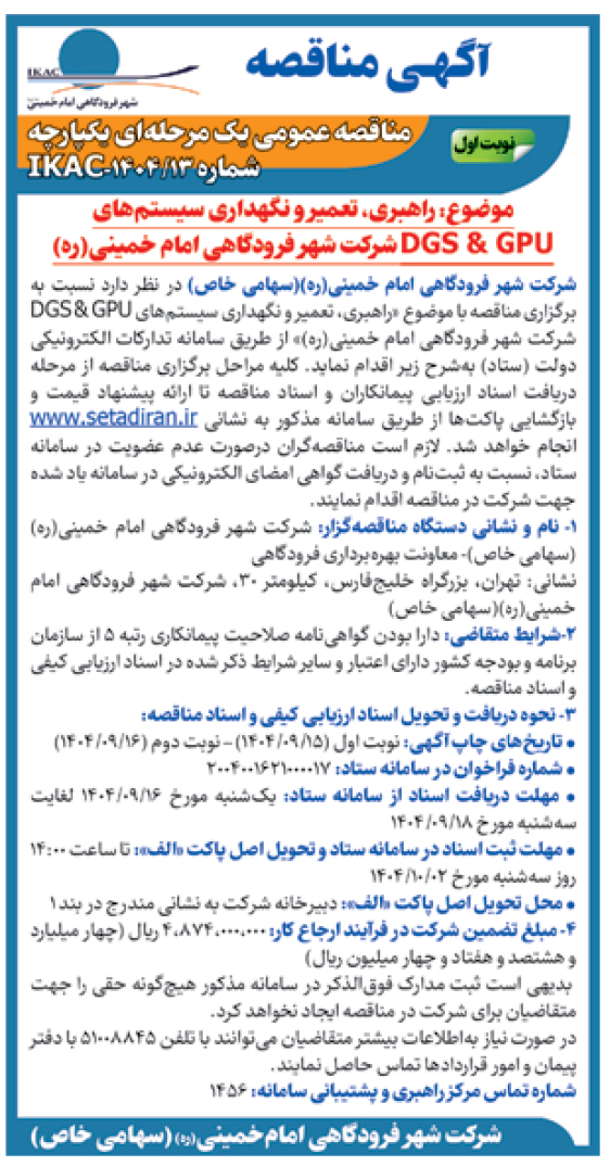 موضوع: راهبری، تعمیر و نگهداری سیستمهای DGS & GPU شرکت شهر فرودگاهی امام خمینی(ره)