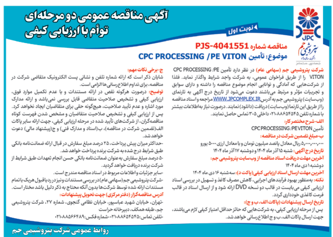 آخرین مهلت دریافت اسناد مناقصه از وبسایت پتروشیمی جم: