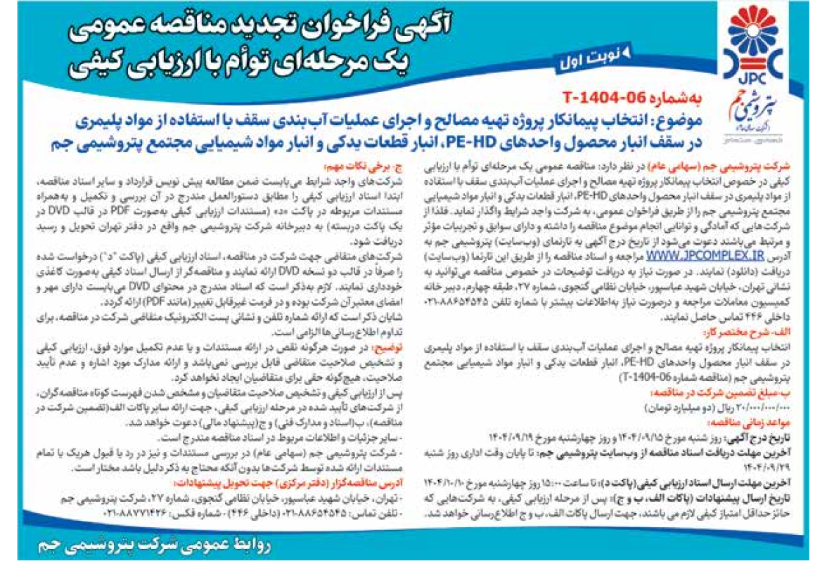 مناقصه شماره PJS-۴۰۴۱۵۵۱ موضوع: تأمین CPC PROCESSING /PE VITON
