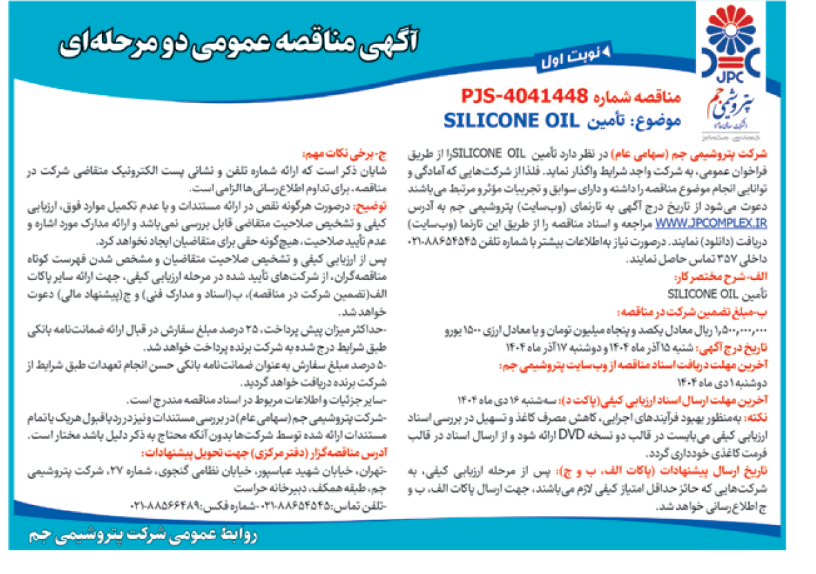 آخرین مهلت دریافت اسناد مناقصه از وبسایت پتروشیمی جم: تا پایان وقت اداری روز شنبه 29/09/1404