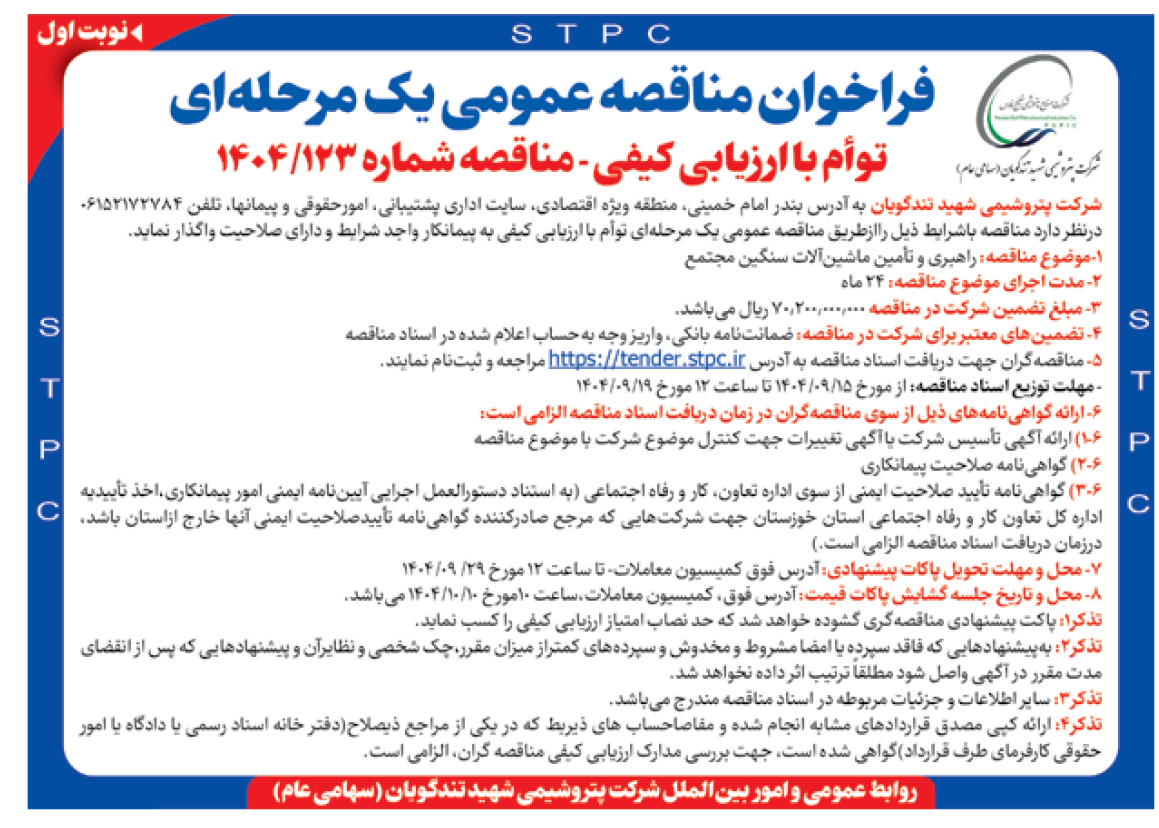 فراخوان مناقصه عمومی یک مرحلهای توأم با ارزیابی کیفی - مناقصه شماره ۱۲۳/۱۴۰۴