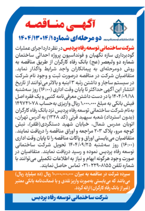 متقاضیان شرکت در مناقصه درصورت ثبت و وجود نام شرکت در سیستم ساجار و داشتن رتبه 3 ابنیه و بالاتر میتوانند از تاریخ انتشار این آگهی حداکثر تا پایان وقت اداری (16:00) روز سهشنبه 18/09/1404 با در دست داشتن معرفینامه کتبی و یک فقره اصل فیش بانکی به مبلغ 1،000،000 ریال واریزی بهحساب 149741078 بهنام شرکت ساختمانی توسعه رفاه پردیس نزد بانک رفاه کارگران (بدون استرداد) شعبه سپهبد قرنی (کد 1328) به آدرس تهران، اتوبان مدرس شمال، خیابان شهید دستگردی(ظفر)، نبش کوچه مرو، پلاک 203 مراجعه و اوراق مناقصه را دریافت نمایند. متقاضیان میبایستی اوراق و پاکات مناقصه را تا پایان وقت اداری (16:00) روز سهشنبه 25/09/1404 تحویل شرکت ساختمانی توسعه رفاه پردیس نموده و رسید دریافت نمایند. متقاضیان در صورت وجود هرگونه ابهام و نیاز به اطلاعات تکمیلی میتوانند با شماره تلفن 22908155 021 - تماس حاصل نمایند.