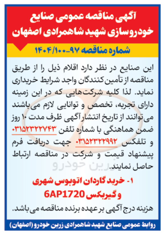 این صنایع در نظر دارد اقلام ذیل را از طریق مناقصه از تأمینکنندگان واجد شرایط خریداری نماید. لذا کلیه شرکتهایی که در این زمینه دارای تجربه، تخصص و توانایی لازم میباشند میتوانند از تاریخ انتشار آگهی ظرف مدت 10 روز ضمن هماهنگی با شماره تلفن 03152322743 و تلفکس 03152322992 جهت دریافت فرم پیشنهاد قیمت و شرکت در مناقصه ارتباط حاصل نمایند.