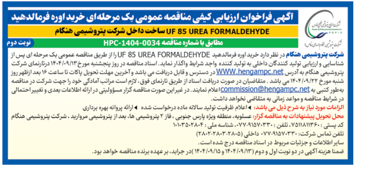 ضمنا هزینه آگهی در دو نوبت اول و دوم (13/09/1404 و 15/09/1404 )در جراید، بر عهده برنده مناقصه خواهد بود.