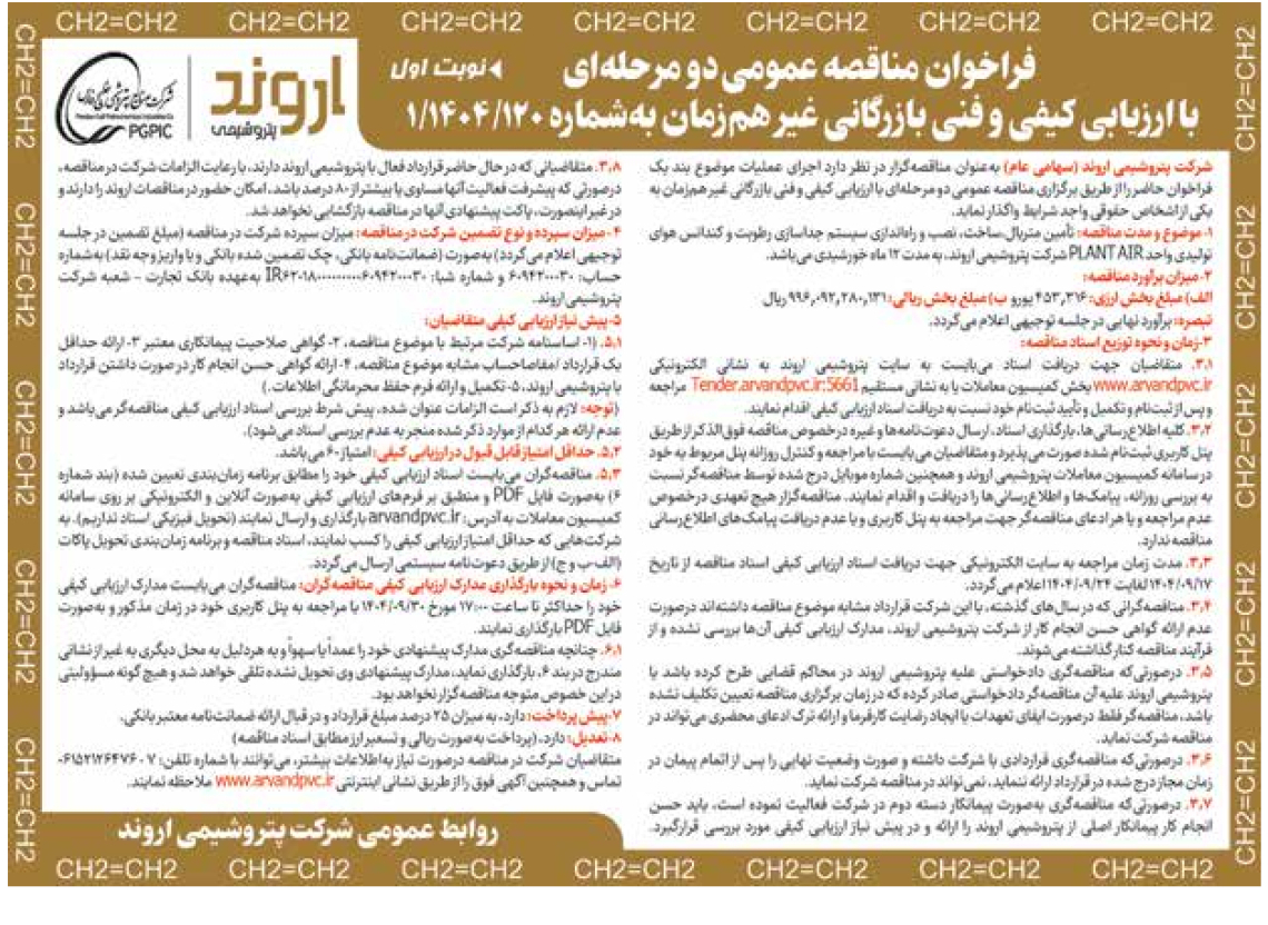 متقاضیان شرکت در مناقصه درصورت نیاز بهاطلاعات بیشتر، میتوانند با شماره تلفن: 7 - 06152126476 تماس و همچنین آگهی فوق را از طریق نشانی اینترنتی www.arvandpvc.ir ملاحظه نمایند.